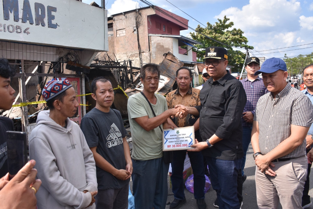 Penjabat (Pj) Bupati Kapuas H Darliansjah didampingi Sekda Kapuas Septedy dan sejumlah Kepala OPD terkait melakukan peninjauan sekaligus memberikan bantuan kepada warga yang terdampak musibah kebakaran di Jalan Letjend Suprapto, Kelurahan Selat Hilir, Minggu (27/10/2024).